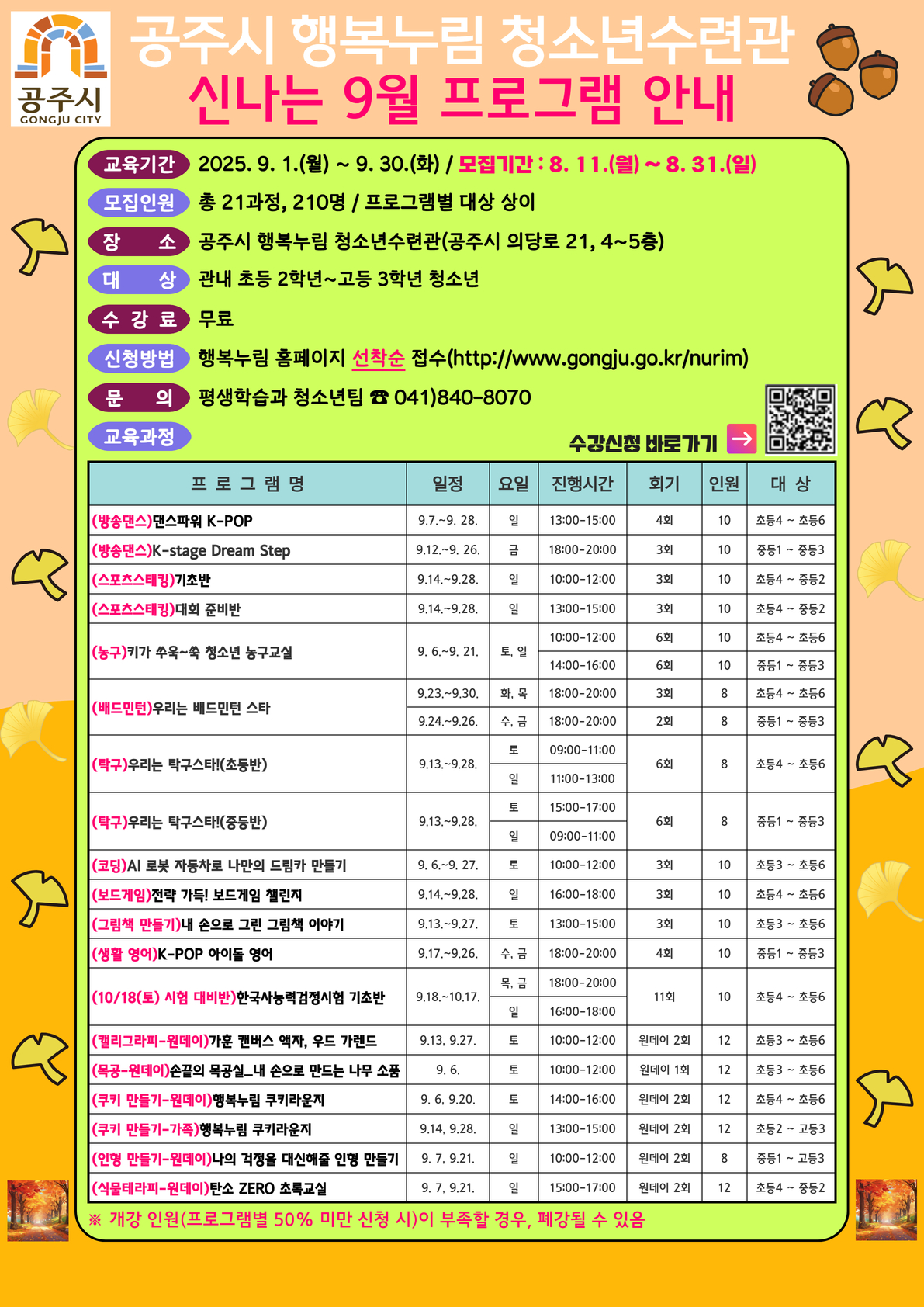 | 23 | 청소년수련관 | 행복누림 청소년수련관 10월 프로그램 추가 오픈 및 개설 공지(오픈: 9/22(월) 10시) | 평생학습과 | 655 | 2025-09-19 | |