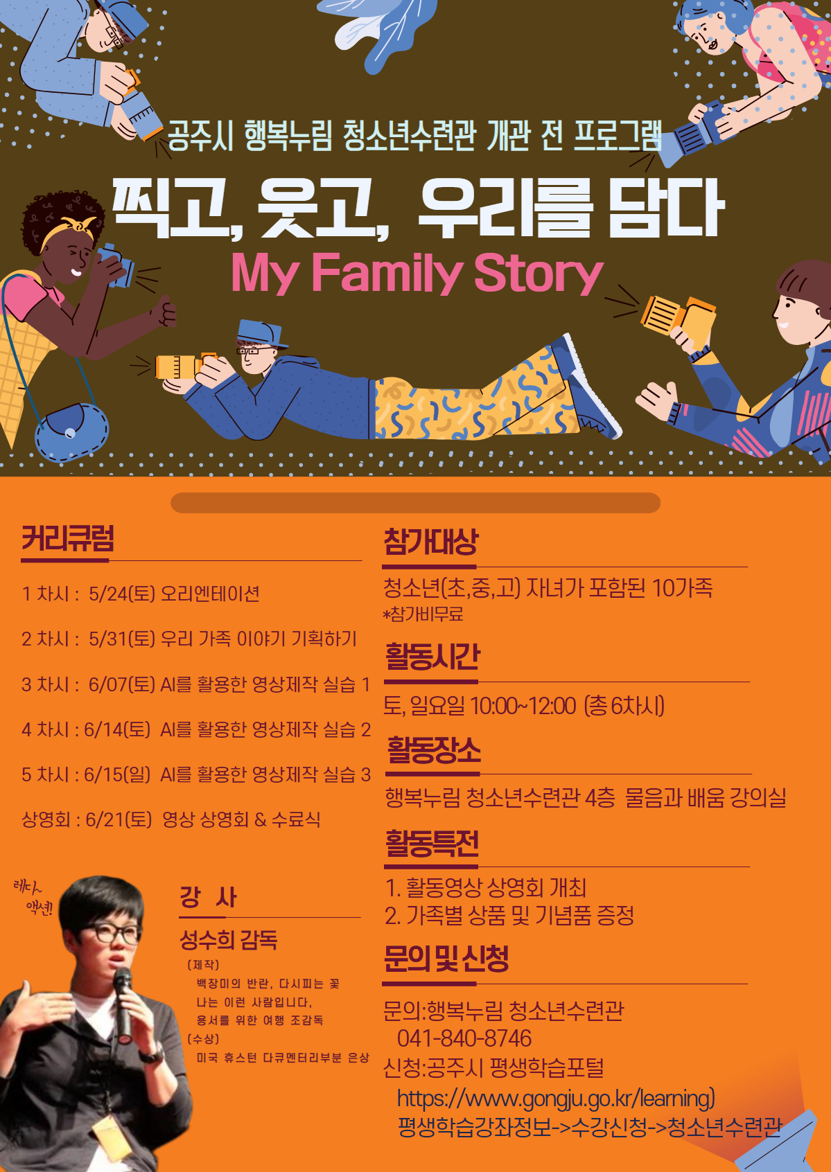 | 강좌명 | 찍고, 웃고, 우리를 담다(My Family Story) | 교육기간 | 2025-05-24~ 2025-06-21 |