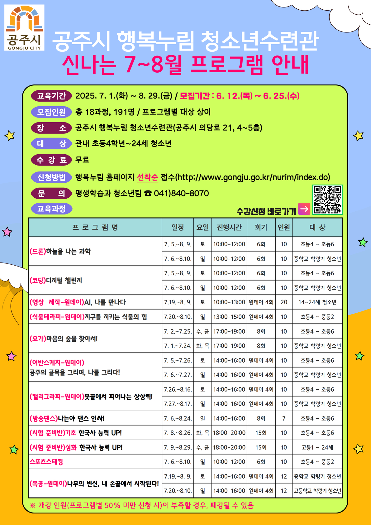 | 접수기간 | 2025-06-29 09:00 ~ 2025-07-20 18:00 | 지역 | 공주시전체 |