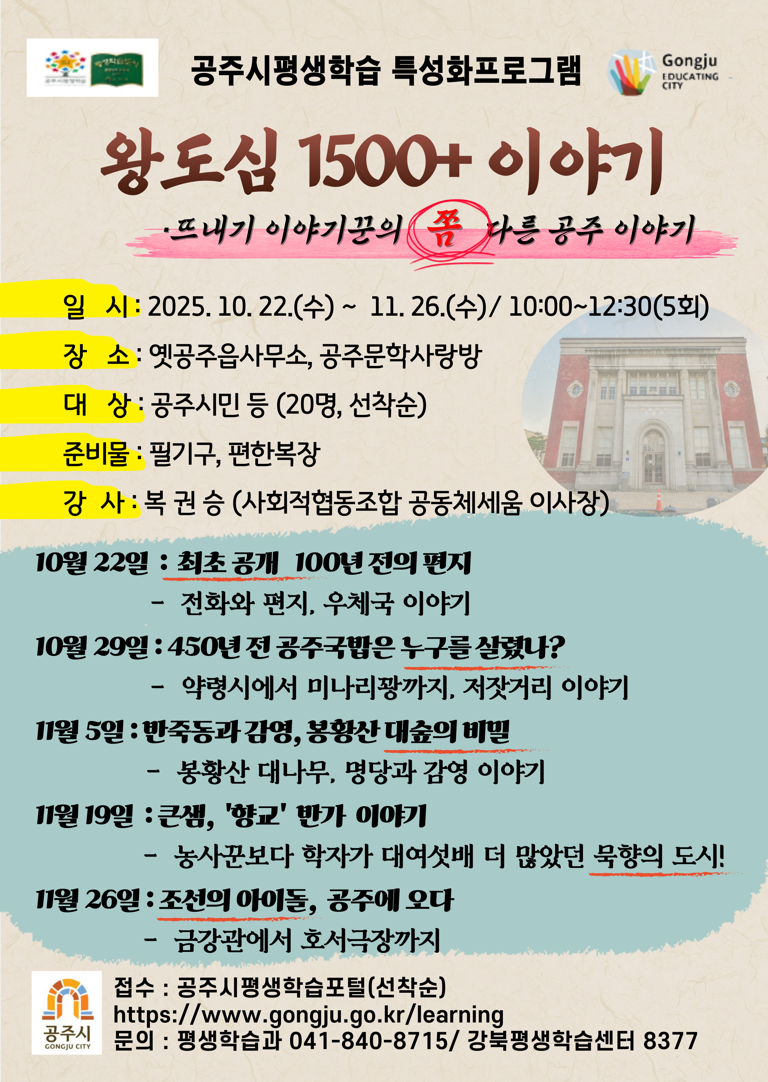 | 교육장소 | 옛공주읍사무소, 공주문학사랑방(하숙마을) | 정원 | 20 |